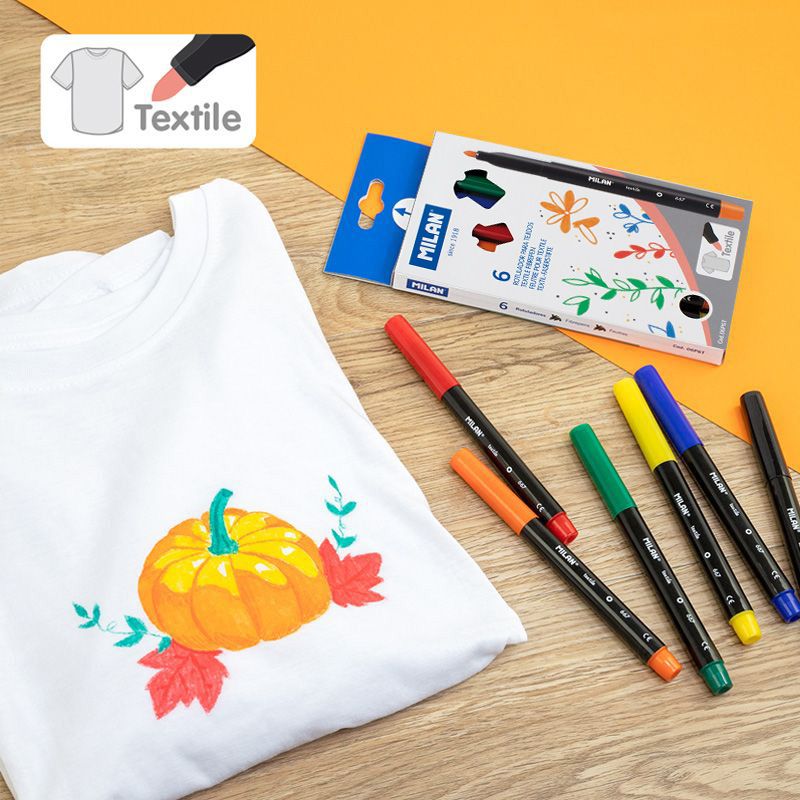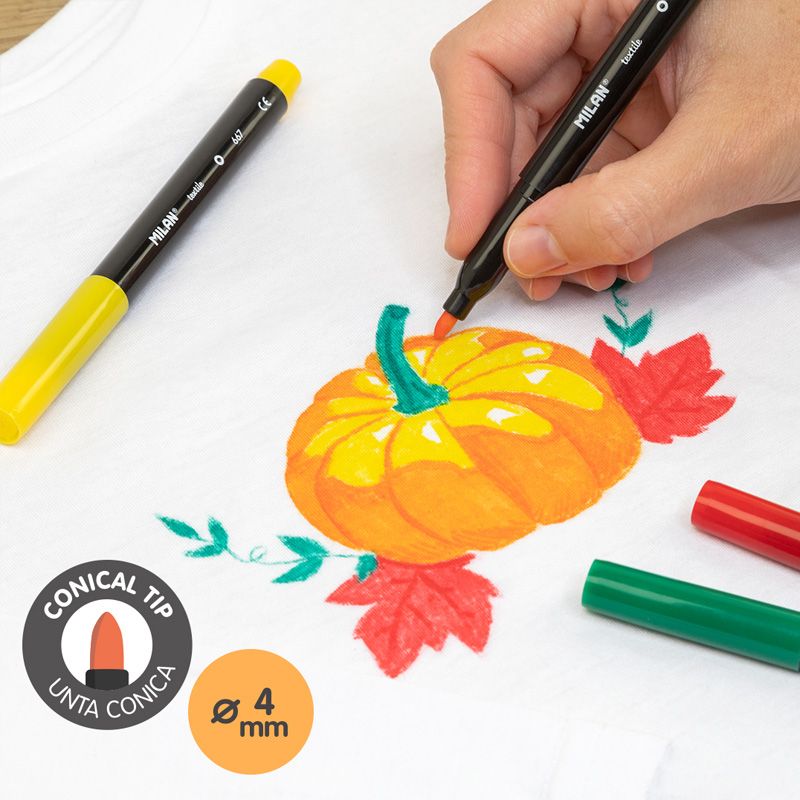 Fibrepens for writing on fabric for school use. Bullet tip 4 mm Ø It adapts to the surface of the fabric, making it easy to use. It is best todraw out an initial outline using a pencil and then colour in using thefibrepens. Place some cardboard or plastic on the other side of the drawing to prevent the opposite side of the fabric from becoming stained. Once dry, you can "set" the drawing by ironing on the back using the hottest temperature setting available for that fabric. 6 colours: yellow, blue, orange, black, red, green. With a perforated safety cap.