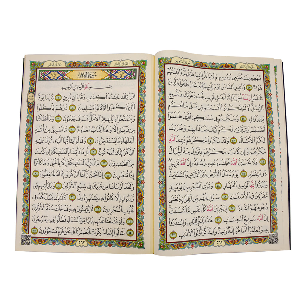 مصحف دبل جوامعي فاخر بحجم 35×50 سم، مطبوع على ورق شاموا عالي الجودة يوفر متانة وسهولة في القلب. يتميز بتذهيب الأطراف الذي يضيف لمسة جمالية راقية، وغلاف فني متين يحافظ على سلامة المصحف. مزود برمز QR يتيح الوصول السريع للمحتوى الرقمي. خيار مثالي للمكتبات والمؤسسات الإسلامية والاستخدام الشخصي الفاخر