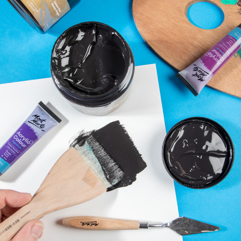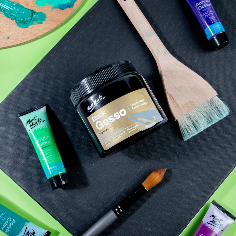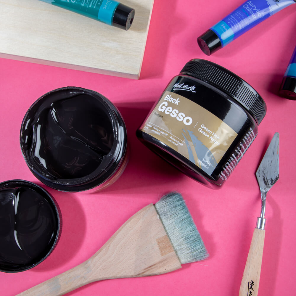 Mont Marte Black Gesso provides a flexible matt finish suitable for priming and sealing canvas, paper, board and other semi-porous surfaces. Gesso provides a slightly toothed surface that allows oil and acrylic to adhere well to your painting support. For best results apply 2-3 thin coats of Black Gesso.