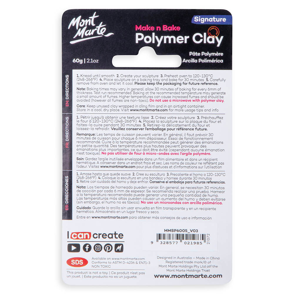 Mont Marte Make 'n' Bake Polymer Clay is an easy to use, malleable and non toxic synthetic clay. It is ideal for use in press moulds, pattern making, figure and doll modelling, canes, beading, jewellery and many other sculptural projects. The clay holds very fine detail, features very good shape stability and when cured has minimal shrinkage.