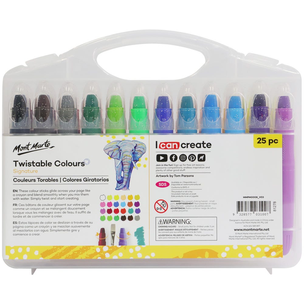 Mont Marte Studio Twistable Colours come in 24 blendable colours and with 1 paintbrush. You can blend them by hand or with water. Ideal for any art, craft or school project.