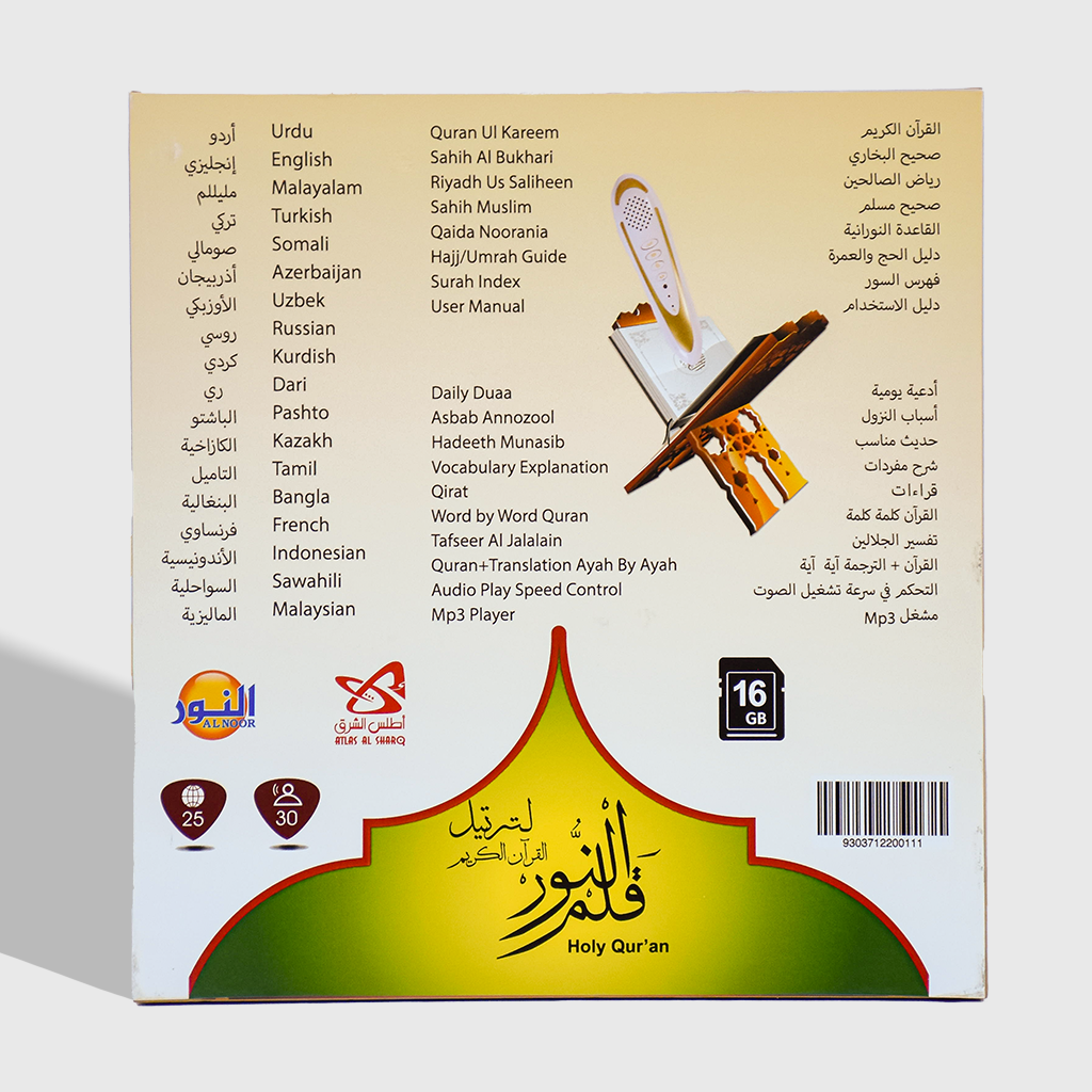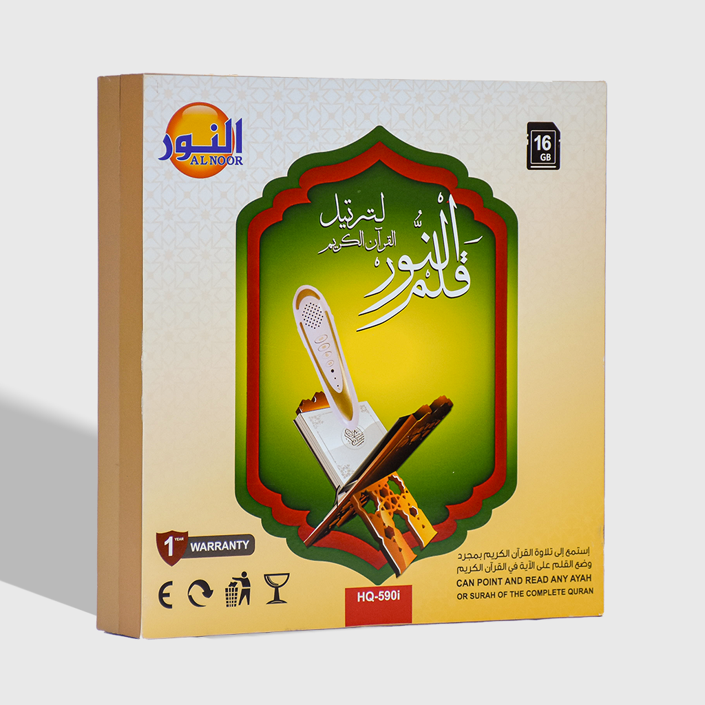 قلم القرآن الإلكتروني Al Noor HQ 480 I بسعة 16 جيجابايت، يقرأ أي آية أو سورة من المصحف الشريف بصوت 30 قارئًا ويدعم 25 لغة.