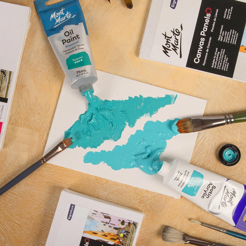 Mont Marte Signature Canvas Panels offer an inexpensive painting support with the look of painting on canvas. Panels provide a sturdy, non-flexible surface and are great for painting outdoors as they are compact and easily transported. Canvas Panels are also less prone to damage than stretched canvases. Because of their sturdy construction they are also fantastic for collage techniques. Acrylic titanium primed and ready to be painted on, these Panels are suited for use by students through to professionals.