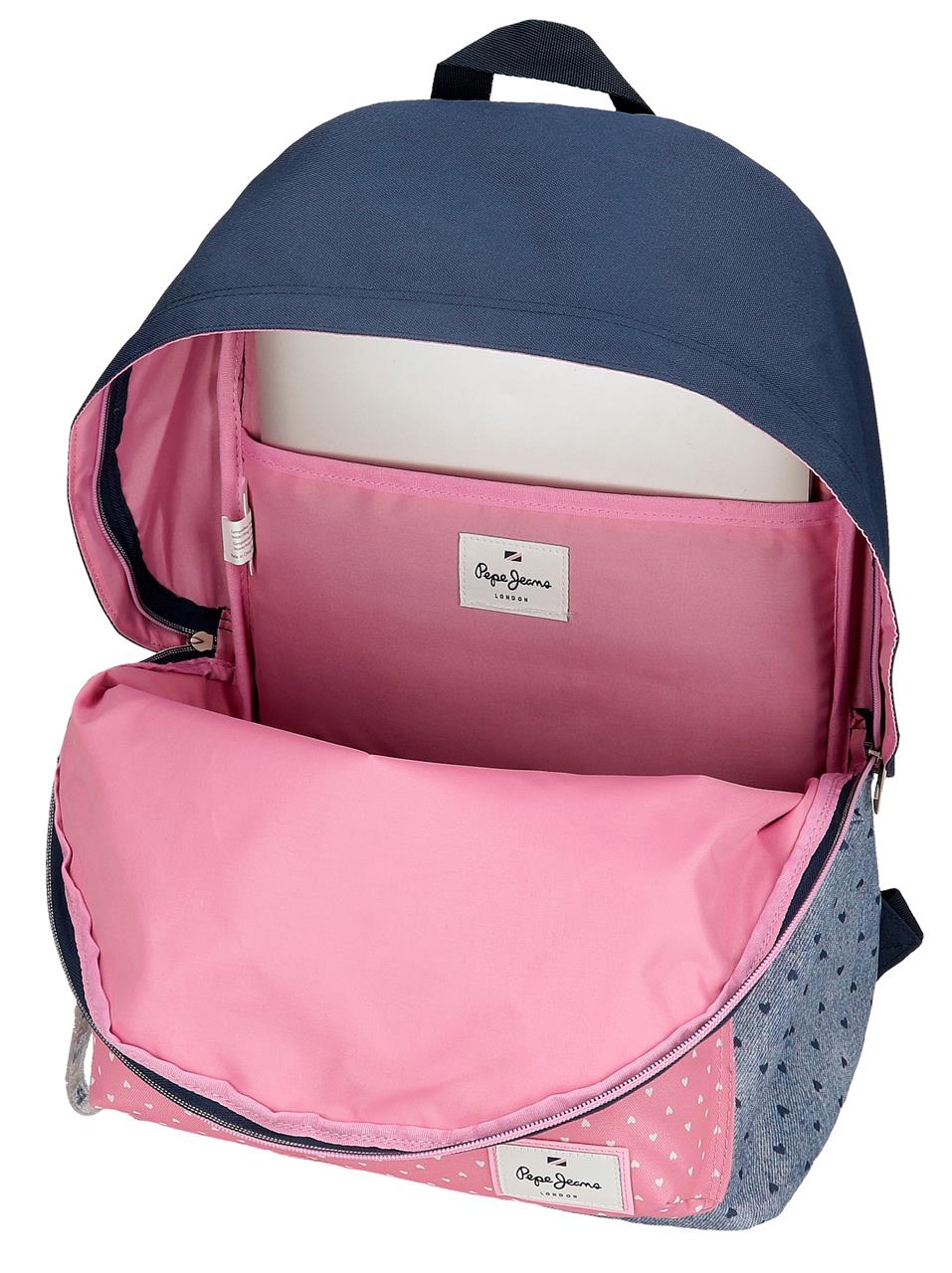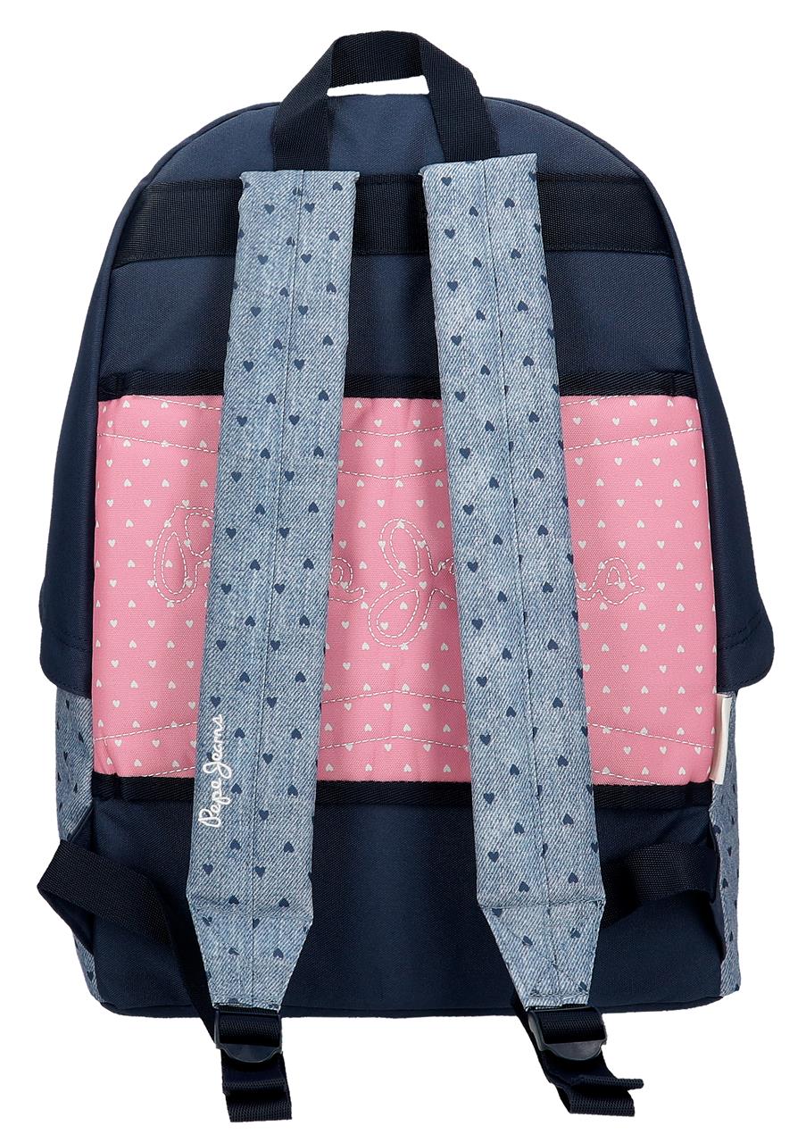 This 44cm Pepe Jeans backpack combines vibrant pink and blue hues with practical design, offering ample space for daily essentials. Crafted for durability and comfort, it features adjustable straps and multiple compartments to keep belongings organized, making it an ideal choice for students and professionals seeking both style and functionality.