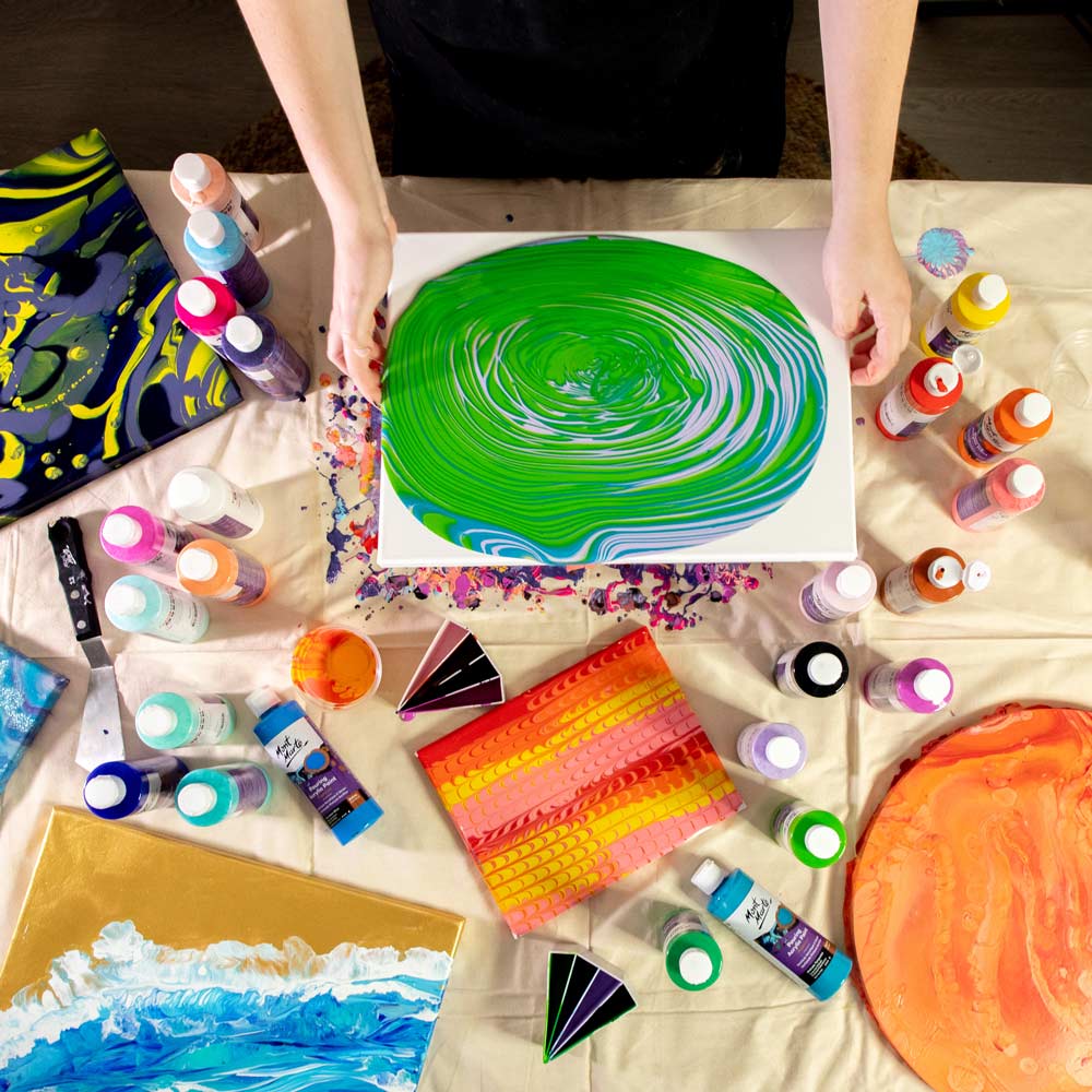 Create stunning fluid artworks with our acrylic pouring paint range. This paint is pre-mixed and ready to flow! So choose your colours and get ready to see some amazing effects come to life on your canvas.