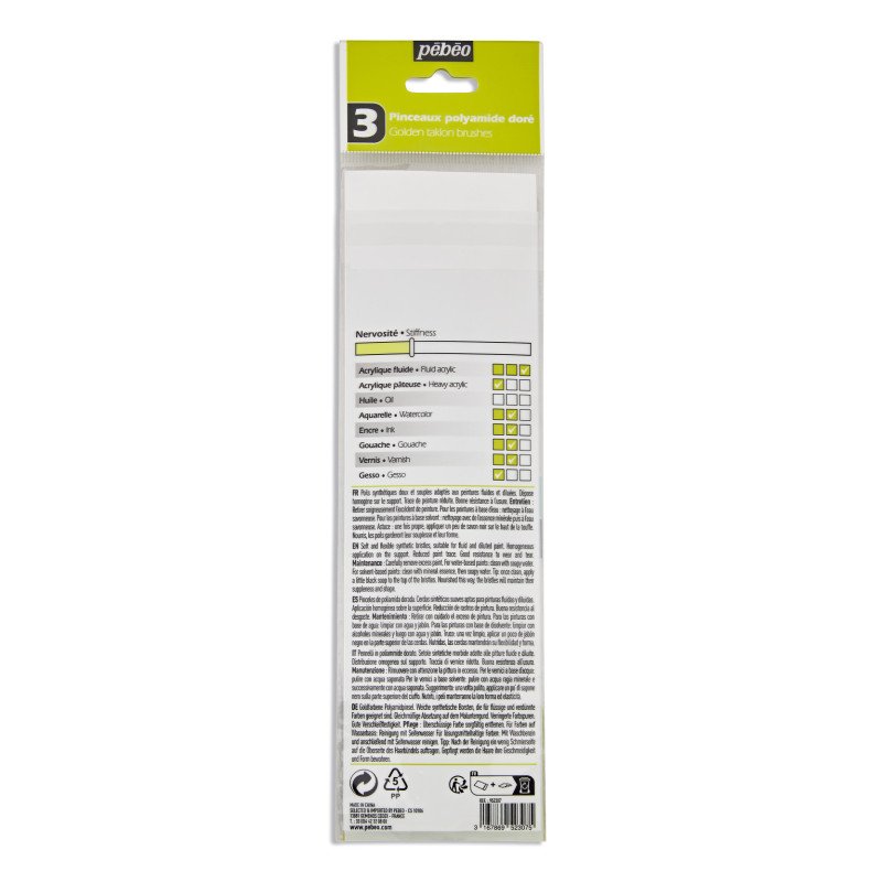 Pébéo's brushes are made of golden taklon, a fine synthetic fibre suitable for all types of work on all surfaces. The soft, flexible bristles provide even colour application and are suitable for fluid paints such as acrylics. Traces are thus reduced. Good resistance to wear and tear.