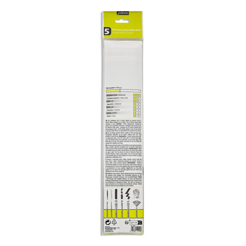 Pébéo long handle brushes in golden taklon are perfectly versatile. Their fine synthetic fibre is suitable for all types of work on all types of surfaces. The soft, Flexible bristles provide even colour application and are suitable for fluid paints such as acrylics. Traces are thus reduced. Good resistance to wear and tear.
