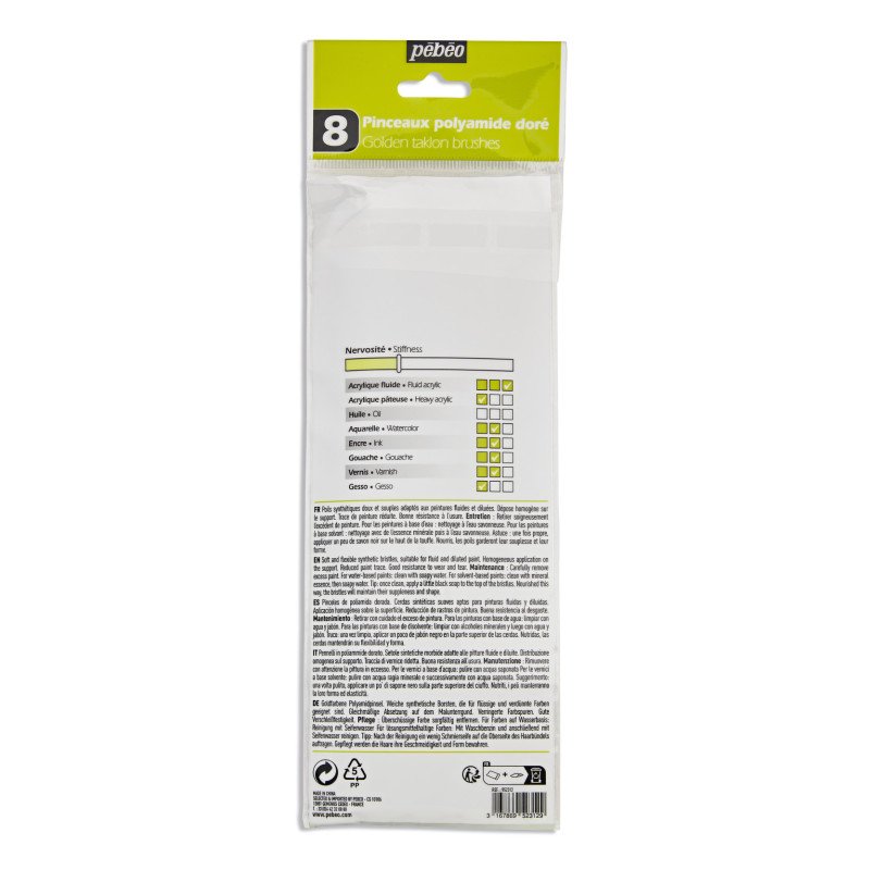 Pébéo's brushes are made of golden taklon, a fine synthetic fibre suitable for all types of work on all surfaces. The soft, flexible bristles provide even colour application and are suitable for fluid paints such as acrylics. Traces are thus reduced. Good resistance to wear and tear.