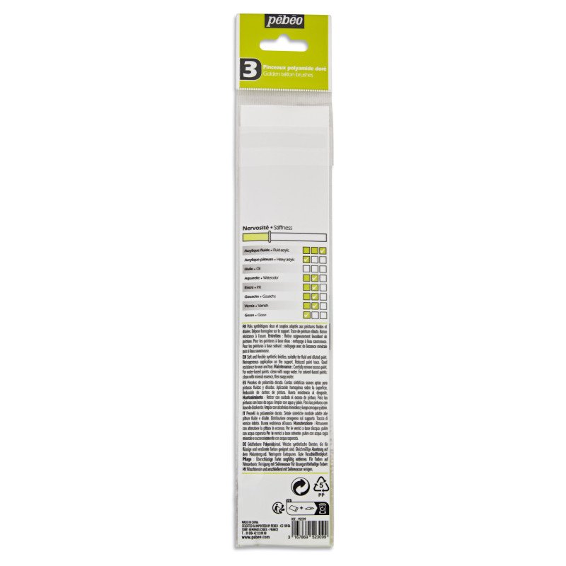 Pébéo's brushes are made of golden taklon, a fine synthetic fibre suitable for all types of work on all surfaces. The soft, flexible bristles provide even colour application and are suitable for fluid paints such as acrylics. Traces are thus reduced. Good resistance to wear and tear.