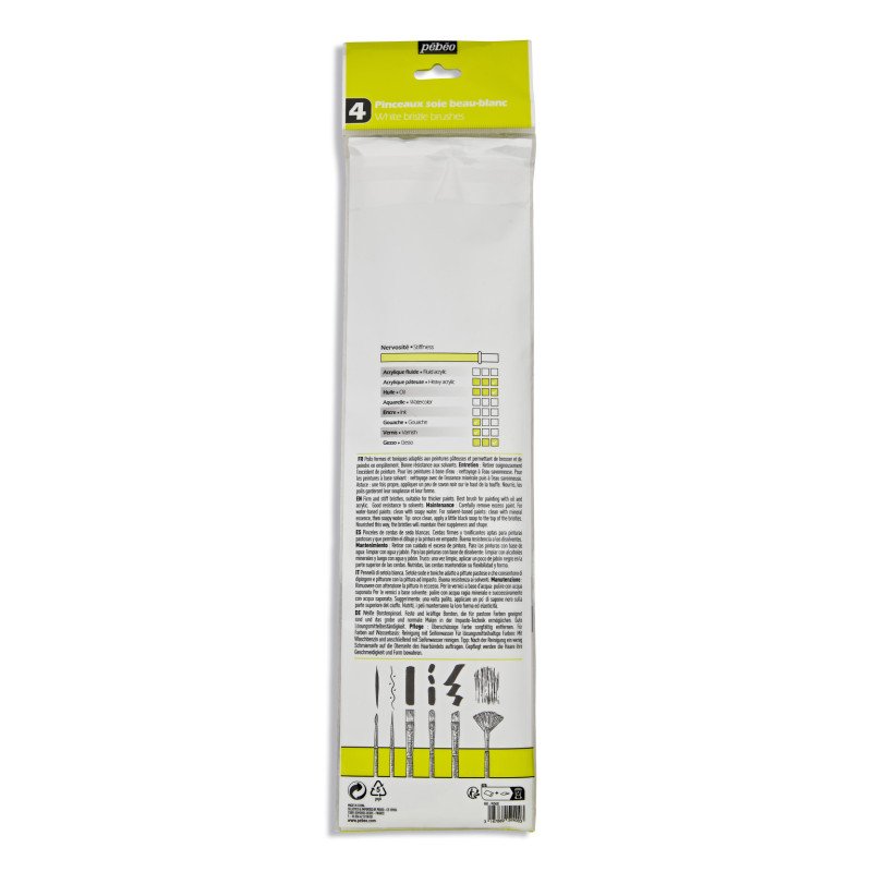 Pébéo's long-handled pure white brushes have firm, toned bristles ideal for thicker paints for blending and impasto painting. Good solvent resistance, excellent durability.