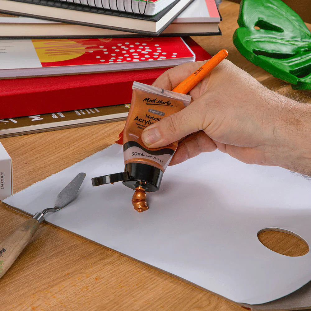 This 4 piece set allows artists and decorative painters to add reflective metallic touches to art and craft projects. Gold, silver, copper and bronze acrylics produce a luxurious metallic sheen on surfaces such as canvas, card and wood. Mont Marte Metallic Acrylics offer smooth consistency and opaque coverage for an authentic metallic look.