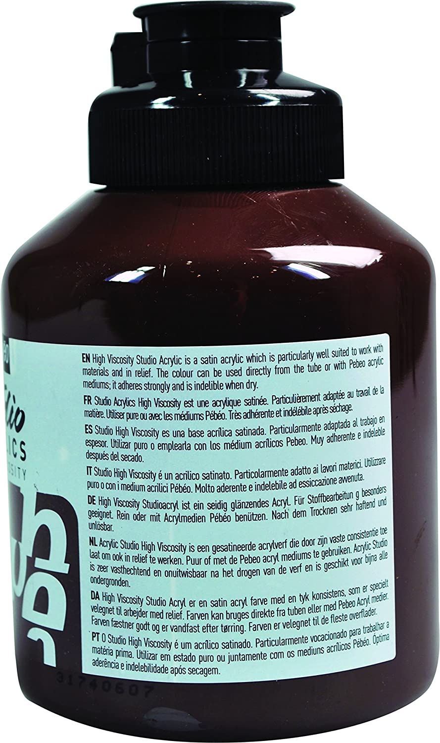 PEBEO Studio Acrylic High Viscosity Paint 500ml are satin-finish acrylic paint developed with the same precision as the Extra Fine series. This range has been created by artists and specialists to improve technical possibilities. The formula guarantees the absence of heavy metals which are toxic and damaging to the environment. These colours are contemporary and deep with rich pigmentation, and offers a satin/matt finish with very good lightfastness. Very adherent once dry, suitable for most surfaces.