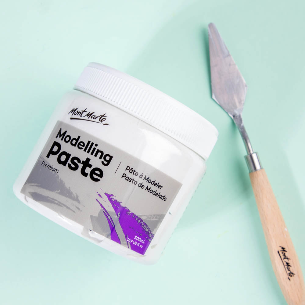 Mont Marte Modelling Paste is fantastic for creating textured backgrounds on a variety of surfaces. Depth of texture can be built up by adding layers once paste is dry. Small objects may also be embedded into the paste for other 3D effects. Great when applied with Mont Marte Palette Knives. Clean up with water.